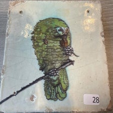 Zelfde voorstelling van een vogel op spijker als de tegel boven maar deze tegel is veel flatser van kleur.
