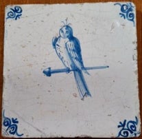 Links een prachtige geschilderde spijkervogel met de afbeelding van een papegaai. Maar de tegel is wel recentelijk gemaakt. De gaatjes in de hoeken zijn wel erg groot uitgevallen. Ter vergelijking rechts een spijkervogel met dezelfde voorstelling die wel door de SWAEN in de 17e eeuw is vervaardigd.