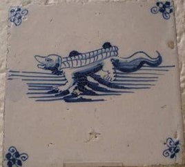 Drie tegels met de voorstelling van een varaan? Of zou men toch een krokodil bedoeld hebben? Omstreeks 1650.