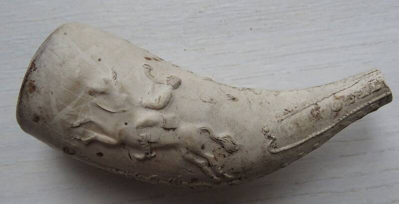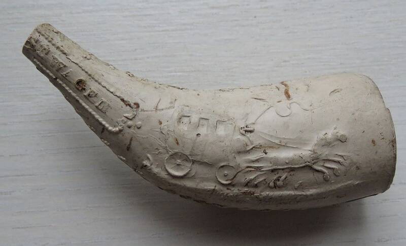 Kleipijp (Ds21FM06) hoornpijp met aan de ene kant een postkoets met paarden en aan de andere kant een ruiter te paard, postiljon. Op de steel de tekst POSTILJON en KOETSWAGEN. Omstreeks 1880.
