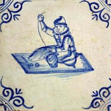 Tegels met kleermakers aan het werk en tegel met man met kleermakersschaar. 17e eeuw