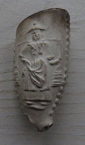 Kleipijp met een vrouw en man met juk en emmers. De man pijprokend. Gouda. Ca. 1710-1730