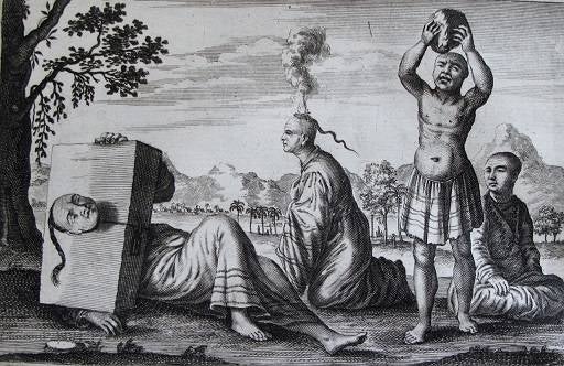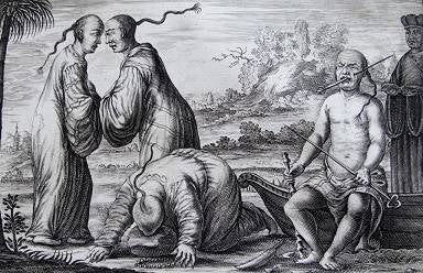 17e eeuwse gravure met oud Chinees foltertuig dat werd gebruikt om te straffen.De houten halskraag stond bekend als de straf van de Kea of Cangue. Coll: Edwin van Drecht