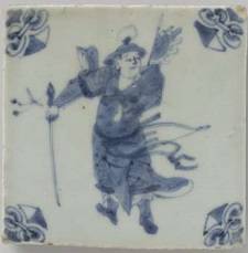 Maar hoe dan ook, de belangstelling voor alles wat Chinees is, was in de Nederlanden gewekt. En meer dan dat, met grote “Delfts blauwe” gevolgen welke is gebaseerd op het in het einde van de 15e eeuw naar Europa gebrachte Chinees porselein uit de Ming-dynastie. De Hollandse afbeeldingen op porselein, aardewerk en tegels, zijn vaak nuchter en tijdsgebonden in hun opzet; koetjes en kalfjes, bloemetjes en bijtjes. De Bijbeltegels worden als groep vaak al te gemakkelijk allemaal als “historisch” aangemerkt. Maar het bijzondere van de Chinese decoraties op o.a. tegels is dat zij vergeleken met de Europese die een -‘vooruitgang’ belangrijk vonden,- de Chinezen afbeeldingen veel meer traditioneel georiënteerd waren. We zien tegels met afbeeldingen van lijfstraffen, tempelrituelen, jonken op het water, klederdrachten, het keizerlijk hof, de lange vlecht van de mandarijn, krijgslieden, de Samoerai, voorstellingen uit de opera met rituele dans en zelfs bouwwerken in pagode stijl. De meesten als personen weergegeven dus. Dieren als centraal decor en andere typisch Hollandse voorstellingen zien we niet op de naar Chinese voorbeelden geschilderde tegels. Wel soms een vogel of vis als vrij groot hoekornament. Het valt mij op dat het de toch wel ludiek te noemen Hollandse tegelschilders is gelukt, -dat zij de discipline hebben kunnen opbrengen,- om de Chinese voorstellingen op de tegel met rust te laten en geen typisch Hollandse toevoegingen hebben gedaan. Mocht u toch een Chinese voorstelling hebben met op de achtergrond een molen, boerderij, twee koeien en struikgewas, dan horen we dat graag…
