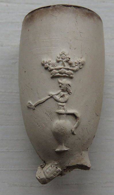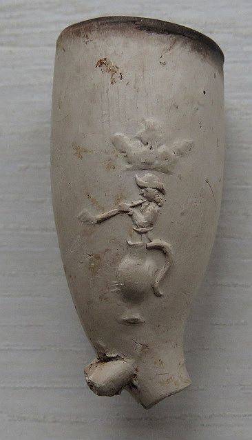 Vijf kleipijpen met de voorstelling van een rokende manen in een kan en op een stoel. Omstreeks 1730-1750.