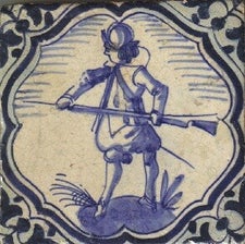 Ook deze keer hebben we weer een flink aantal tegels opgetrommeld die passen binnen het thema soldaten op antieke tegels. Zoals piekeniers, soldaten met musket al dan niet schietend, soldaten getooid met zwaard, trommels, vaandels, vlaggen enz. enz. Sommige tegels waarop een persoon met geweer is te zien doen door de kleding twijfelen of het wel om echte soldaten gaat. Wellicht passen deze tegels beter in het thema jacht.
