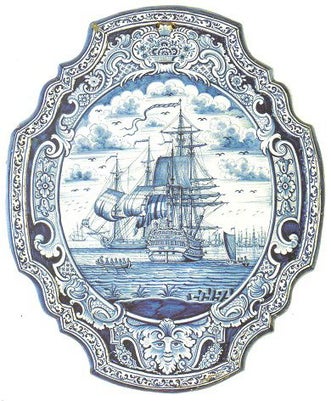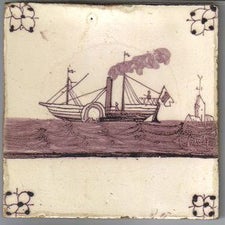 Samen met mijn “Tegelvriend uit Amsterdam” wil ik deze keer met U schepen op tegels nader bekijken. Tegels met schepen zijn gewild bij verzamelaars en zelfs ook bij niet verzamelaars. Zeker als er mooie details of kleuren op voorkomen zoals een gekleurde vlag, katrollen of geschutspoorten. Bijgaand laten wij U mooie blauwe en paarse tegels met schepen zien, maar ook enkele gekleurde schepen die tot de zeldzamere tegels met schepen gerekend mogen worden. Nog mooier is het als de kanonnen een salvo afgeven met grote rookwolken op de blauwe of paarse tegels en tableaus. Wat opvalt is dat bij veel blauwe tegels van na ca. 1625 en de minder voorkomende latere paarse losse tegels met schepen er geen wolkenpartijen of enkele zeevogels op de achtergrond geschilderd zijn. Iets wat meestal wel bij tableaus het geval is en zeker bij de grote tableaus die met complete schilderijen te vergelijken zijn.