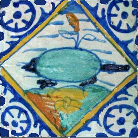 De allervroegste kwadraattegels van rond 1600 met de voorstelling van een schildpad zijn tamelijk primitief uitgevoerd en vrijwel zeker zonder gebruikmaking van een spons geschilderd. Van de wat latere tegels met schildpadden kunnen we aannemen dat de afbeeldingen wel met behulp van een spons zijn geschilderd. Bij de meeste blauwe schildpadden die op tegels staan afgebeeld kunnen we er vanuit gaan dat het om zeeschildpadden gaat. De kleine zeepartijen die onder en rond de zeeschildpadden zijn geschilderd sluiten een landschildpad uit.