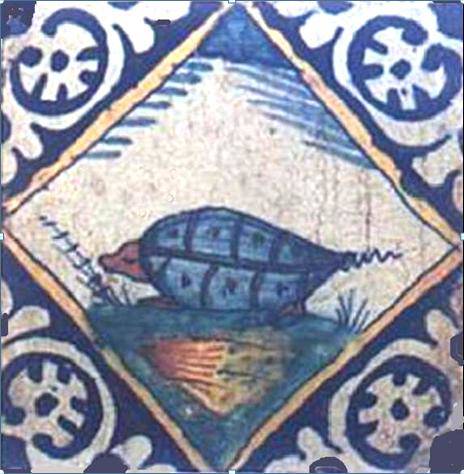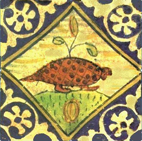Twee kwadraattegels met de voorstelling van een schildpad. Omstreeks 1600. De voorstelling heeft ook wel iets van die van een