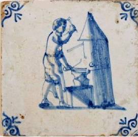 Eerder is een pagina speciaal gewijd aan marskramers op tegels. Marskramers waren lieden, die onder meer hun koopwaar op de rug meedroegen en deze te koop aanboden in steden, dorpen en op het platteland. Marskramers handelden ook in koperwaar vervaardigd door koperslagers. Koperen voorwerpen moesten regelmatig gerepareerd worden als gevolg van intensief gebruik en dit werd gedaan door ketellappers, die regelmatig langs deuren gingen met de vraag of er nog lapwerk was. Onderstaand treft U tegelseries aan met: tegels met personen die koperwerk ( en hamer) dragen, koperslagers aan het werk, en een paar tegels waarbij niet geheel duidelijk is of de voorstelling om een koperslager dan wel om een smid gaat. Het beroep koperslager.