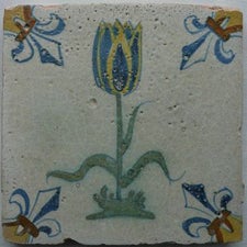 Als hoekvulling de Bourgondische lelie van het type wat niet zoveel voorkomt op polychrome tegels. 1e helft 17e eeuw.