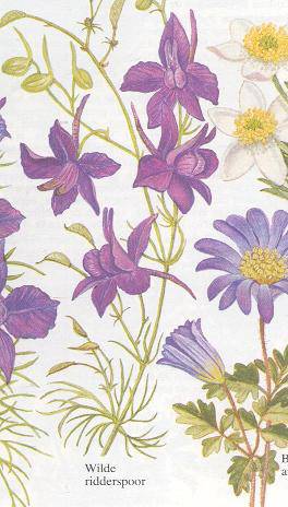 Een kleurenplaat van wilde ridderspoor. Op de afbeelding is het een tot twee centimeter lange spoor aan de bloem