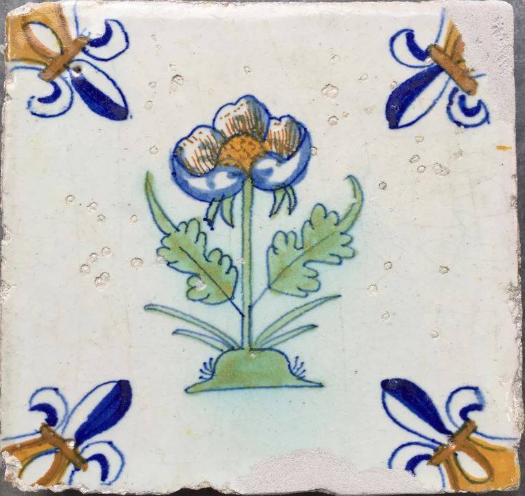 17e eeuwse tegel in Gouda bij de SWAEN vervaardigd met de voorstelling van een bloem: (wilde) ridderspoor