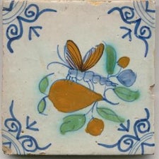 De afbeelding van een insect op deze tegels van ca. 1700 geeft minder problemen. Het betreft de afbeelding van een haft, ook bekend staand als eendagsvlieg, zittend op een stilleven van fruit.