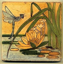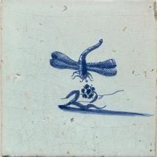 Als een libel zijn laatste vervelling achter de rug heeft en boven de wateroppervlakte uitkomt moet het dier zijn vleugels en lichaam laten drogen voordat hij weg kan vliegen. Op deze 17e eeuwse tegel is dat stadium afgebeeld, hetgeen maar weer eens bewijst dat de tegelschilders met veel gevoel voor precisie te werk gingen bij het overtrekken van het lijnenwerk vanaf de tegelspons. Jammer genoeg is de originele gravure met de voorstelling van de ontluikende libel niet bekend.