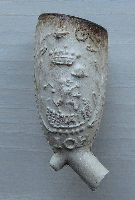Kleipijp met aan de ene kant een standerd wipmolen en IOH en aan de andere kant de leeuw in de Hollandse tuin. Midden 18e eeuw.