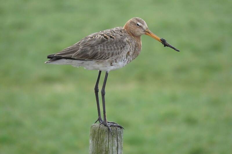 Grutto vrouwtje op paaltje. De snavel nog met verse grond van het bodempikken. Fotografie: Freek Mayenburg
