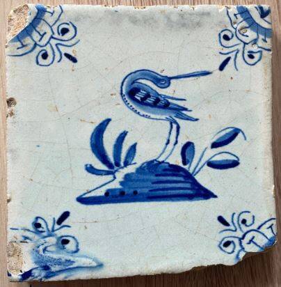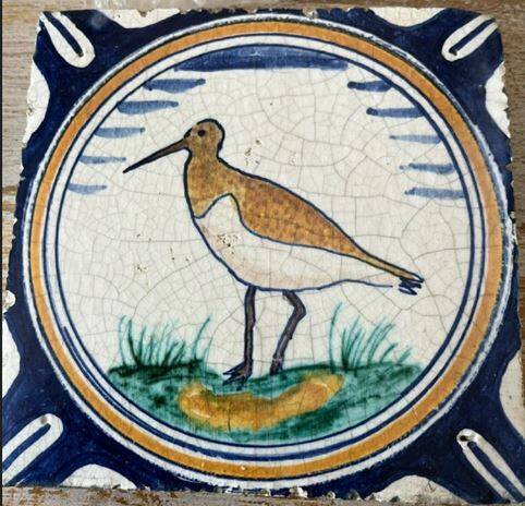 Tegel met een grutto-achtige vogel. 2e helft 17e eeuw. Formaat en lengte van de snavel passen goed.
