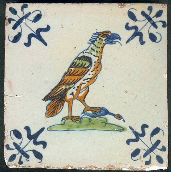 Tegel met de voorstelling van een roofvogel (arend) met gevangen prooi, 17e eeuw. Hoekvulling franse lelie spits.