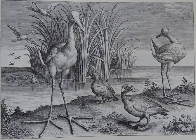 Gravure van Adriaen Collaert met de afbeelding van een jacana of waterfazant. Ca. 1600.