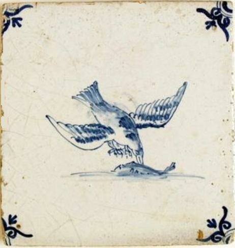 Tegel met een roofvogel die een vis uit het water pakt. Bedoeld kan hier zijn een visarend. Met de klauwen vooruit