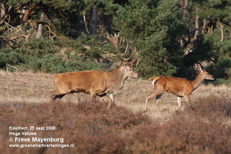 Hoge Veluwe. Hier hebben twee mannelijke edelhert ruzie met elkaar om de vrouwen. Uiteindelijk joeg het linkerhert de ander weg.