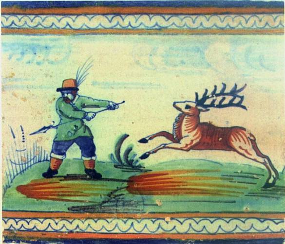 Tegel met edelhert. Midden 17e eeuw. Het gaat hier om een blauwe tegel waarvan de kleuren recentelijk zijn aangebracht. Een nepper dus.
