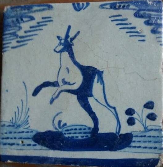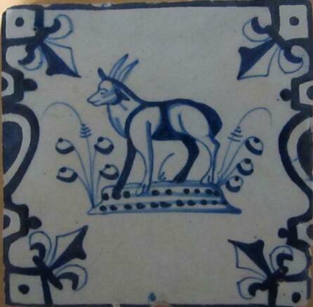 ossenkophoekvulling. Op de rechtertegel staat het spiegelbeeld van het hert ook mooi afgebeeld. Midden 17e eeuw.