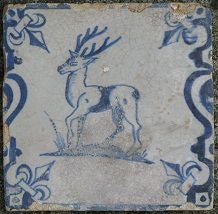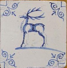 ossenkophoekvulling. Op de rechtertegel staat het spiegelbeeld van het hert ook mooi afgebeeld. Midden 17e eeuw.