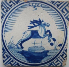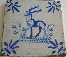 Tegel met edelhert. Midden 17e eeuw. Het gaat hier om een blauwe tegel waarvan de kleuren recentelijk zijn aangebracht. Een nepper dus.