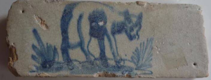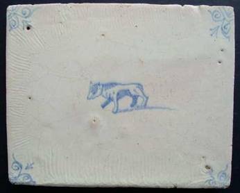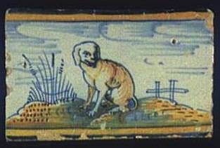 De honden doen sterk denken aan bloedhonden. Het landschap om de honden heen is echter totaal verschillend. Veel voorstellingen op hele vroege kwadraattegels van rond 1570 zijn nog zonder het gebruik van een spons geschilderd. Dit in tegenstelling tot de hierboven afgebeelde kwadraattegels van een hond, welke vrijwel zeker wel met behulp van een spons geschilderd zullen zijn.
