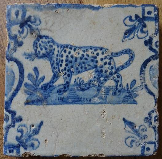 kwadraattegel maar nu beoordeelt als panter-luipaard vanwege de stippen op het lichaam. Datering: 1e helft 17e eeuw.