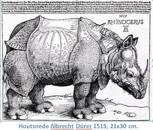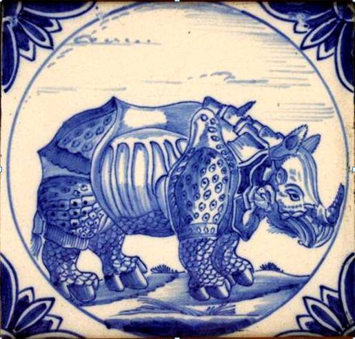 Het voorkomen van een neushoorn op antieke tegels is nog zeldzamer te duiden dan die van een olifant. Vinden wij een neushoorn op onze tegels, dan is dat –tot nog toe- altijd in blauw. Ik ben in mijn onderzoek nog geen vroege gekleurde neushoorn tegen gekomen en zeker niet op een kwadraat, cirkeltegel of openluchtje. Toch zijn er al vroege prenten en gravures van deze 3600 kg wegende reus. Gravures uit 1515 van Albrecht Dürer en van Abraham de Bruyn uit 1583 maar de meest gebruikte pose is die van een prent van Adriaen Collaert uit ca.1612. Ook ben ik hem nog niet tegengekomen in paars op de latere tegels uit de 18e eeuw en verder. Blijkbaar is hij bij de tegelschilders pas ontdekt in het tweede kwart van de 17e eeuw en heeft hij zijn weg gevonden naar het penseel in blauw van hen die dat aandurfden. Net als bij de olifanten met soms de vreemdste constructies van slurven en slagtanden, is ook de afbeelding van een neushoorn met al zijn huidplooien een beetje ludiek te noemen. Niet zo vreemd natuurlijk bij een vrij onbekend dier, maar zo kwam hij of zij wel in het zicht van de westerse bevolking. Grappig is het te zien dat op een enkele tegel met een neushoorn, de schilder zelf twee hoorns heeft geplaatst, nog een kleinere boven de grote, dat kwam niet op de prenten voor, maar bestaat wel. De neushoorns op de prenten met één hoorn, zijn Indische neushoorns. De Afrikaanse neushoorn heeft echter twee hoorns. De meeste neushoorns leven op zichzelf, alleen de witte neushoorn leeft soms in een kleine groep. Neushoornvrouwtjes krijgen maar eens in de 4 of 5 jaar een jong en de eerste 3 of 4 jaar leeft een neushoornjong bij zijn moeder.