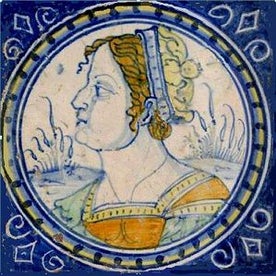Tegel met een vrouwelijk persoon. Antwerpen of Italië. Ca. 1535.