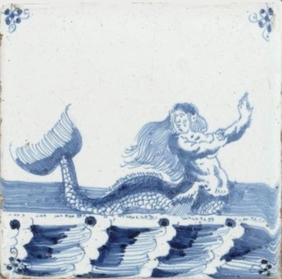 Tegels uit Rotterdam c.a. 1600 van een enkelstaartige en dubbelstaartige vrouw op zee.
